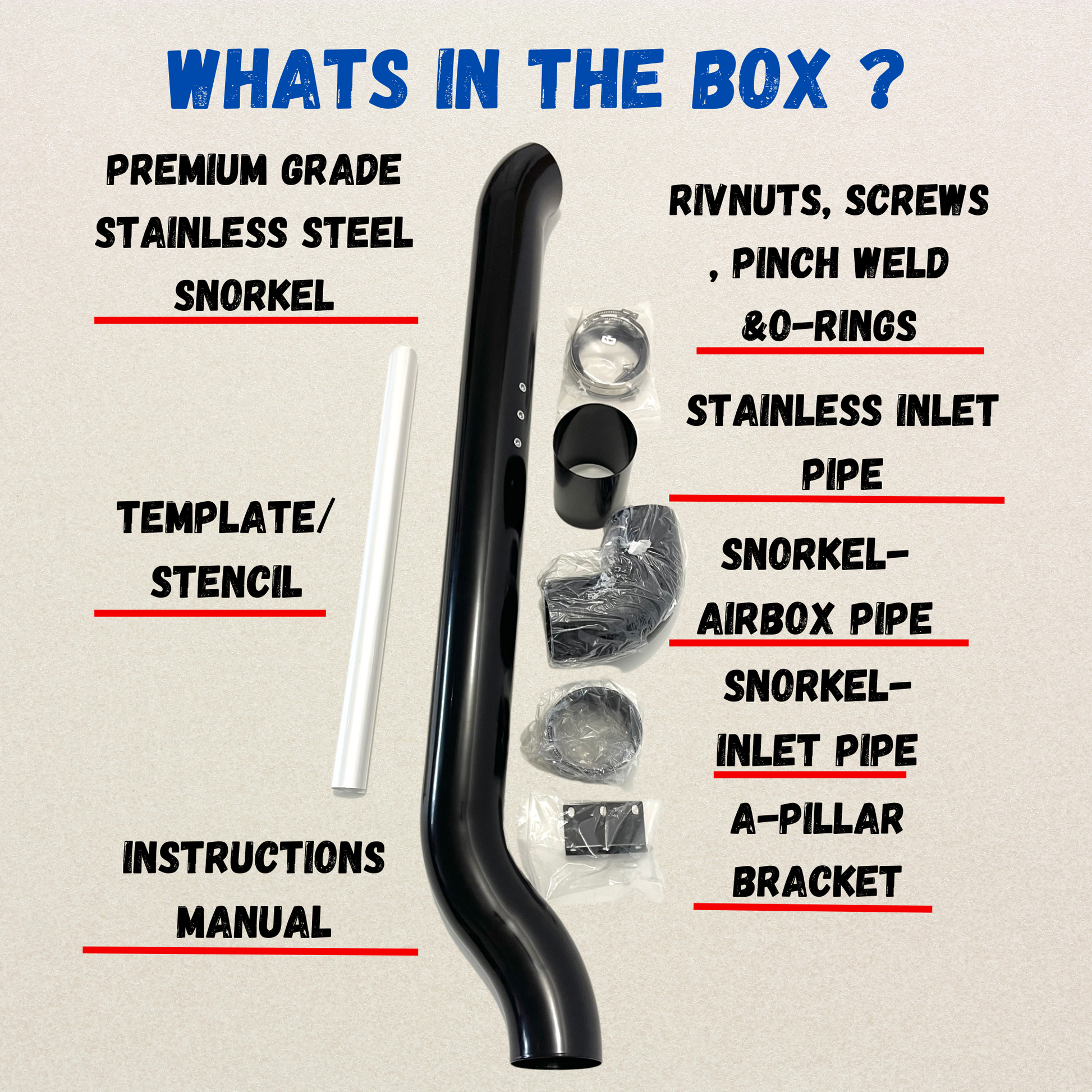 - High-Quality Stainless Steel/Powder Coated Construction:Engineered for maximum strength and corrosion resistance by being powder coated, ensuring your snorkel stays reliable even after years of harsh conditions.